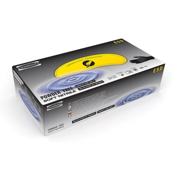 ESD-hansker (Elektrostatisk dissipative egenskaper) for engangsbruk i sort pudderfri nitril. Egner seg til blant annet montering i elektronikkindustrien, bilindustrien, håndtering av fotografisk film, optikk, laboratorier, tatoverings-studio, politi og sikkerhetsfirmaer. - Høy styrke og elastisitet for presisjonsarbeid - Elektrostatisk dissipative egenskaper - Høy styrke og elastisitet - Testet og godkjent for et utvalg kjemikalier - Fingertupper med mikrotekstur for best mulig grep - Inneholder ikke silikon - Vekt 9.1 ± 0.4 g - AQL 1,5, EN 420:2003 + A1:2009, EN 374:2016, EN 16350:2014, CE Cat.III