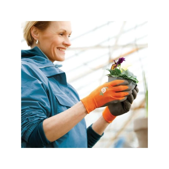 Hagehansker med lateks skumbelegg, sømløst nylonfôr. Mykt, fleksibelt lateksskumbelegg gir godt grep og høy berøringsfølsomhet. Komfortabel, pustende nylonhåndbak. Fargerikt opphengskort for feste på pigg. Passer til: Hagearbeid (jordbruk, logistikk og lager, vedlikehold, detaljhandel). - STANDARDER OG MERKING: EN ISO 21420:2020, CE Cat.I - Håndflate-dyppet - Tørrgrep, våtgrep - Tettsittende - Grå, oransje - Lengde: 21-22 cm