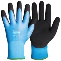 Dobbelt lateksbelegg og vanntett hanske. Komfortable og slitesterke. Belagt med et tynt lag av vanntett lateksbelegg i blått.Et sandaktig lateksbelegg i sort, gir godt våt-, tørt- og oljegrep.