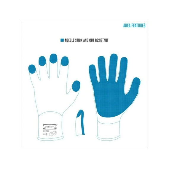 Nålestikkhansker med polyesterfôr. Helbelagt med lateksskum. Nålestikkbestandig materiale i håndflaten, fingrene og fingertuppene gir beskyttelse mot sprøytespisser og øker kuttbeskyttelsen. Standarder og merking: ASTM F2878-2010, EN 388:2016+A1:2018 3X43F, EN ISO 21420:2020 CE-kategori II Testet med hypodermisk nål (25 gauge). Punkteringsmotstand er nivå 5 Gir ekstrem beskyttelse mot kutt, EN388:2016 nivå F (høyeste nivå) Godt grep under tørre og våte forhold Passer til: Avfallshåndtering, gjenvinning, håndtering av gjenstander med skarpe, grove kanter