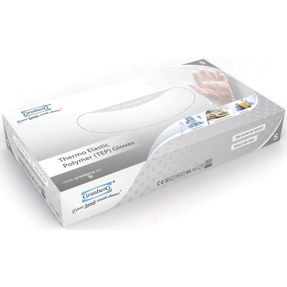 Engangshansker av Termo Elastisk Polymer (T.E.P.). Godkjent for kontakt med alle typer mat, også fettholdig mat (EN 1186). - Mindre avfallsmengde ettersom hansketykkelsen er redusert med mer enn 60 % sammenliknet med vinyl - Opptil mer enn 400 % flere hansker per eske sammenliknet med vinyl - Passer til: Storkjøkken, næringsmiddelindustri, rengjøring - Silikon- og ftalatfri - God fingerfølsomhet - Luktfri - Pudderfri - Farge: klar - Økonomiske - Pakke med 200 stk / 100 par