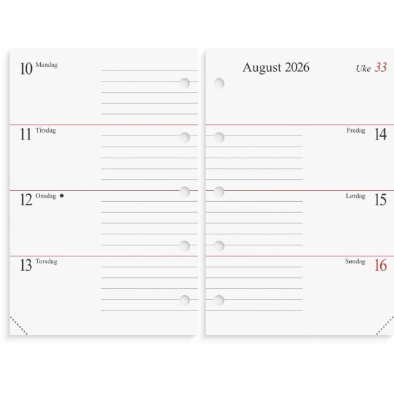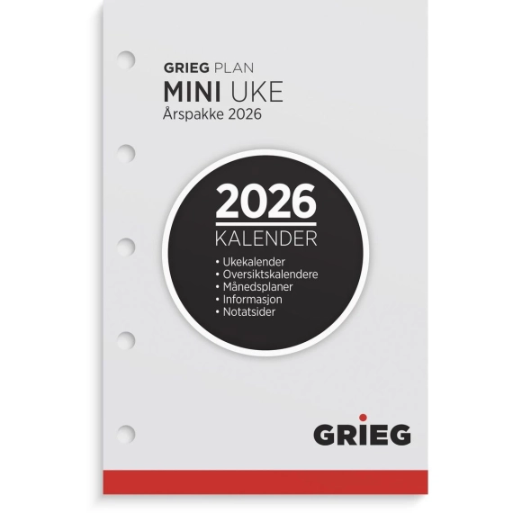 Årspakke for systemkalender. Denne årspakken har ukeoppslag, som betyr at du har hele uken over to sider. Dette gir god oversikt over dine ukentlige avtaler. Den har uttrekkbar månedsplanlegger for inneværende år. Årspakken passer til de fleste systemkalendere. Den inneholder kalendariske opplysninger, telefonguide, månedsoversikt, årsoversikt, månefaser, helligdager og kongelige fødselsdager. Kalenderen er miljømerket FSC®, som betyr at produktet er produsert med papir og annet trevirke fra et ansvarlig og bærekraftig skogsbruk. - Følger kalenderåret - Hullet for ringmekanisme - Passer til de fleste planleggingssystemer - Liggende uke/oppslag - Månedsplaner og årsoversikt for inneværende og kommende år - Månefaser, helligdager og kongelige fødselsdager - Linjerte notatsider - Hjørneperforering - 136 sider - 60g papir - Format: 67x102mm