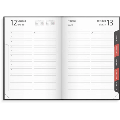 En lekker innbundet dagbok i imitert skinn fra griegs sin Libra serie. Kalenderen er en del av en større serie med Libra kalendere. Felles for disse er at de har et hendig format som gjør den enkel å ta med seg, og en dag pr side gir deg masse plass til å skrive ned dine avtaler og notater. Utstanset månedsregister gjør det enkelt å finne rett måned. Bruk lesebåndet til å markere hvor i kalenderen du er. Hel side på lørdag og søndag. - Spiralisert dagbok kalender for året 2026 - Følger kalenderåret - Omslag i trykket kartong - Stående dag/side - Timeinndeling 8-17 - Hel side på lørdag og søndag - Utstanset månedsregister - Månedsplaner og årsoversikt for inneværende og kommende år - Månefaser, helligdager og kongelige fødselsdager - Hjørneperforering - Antall sider: 408 - Papirvekt: 60g - Format: 120x176mm