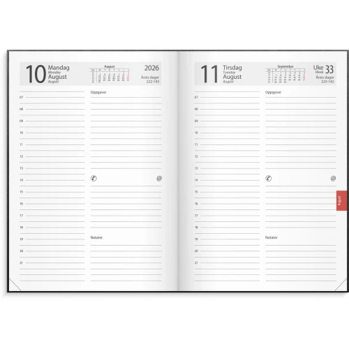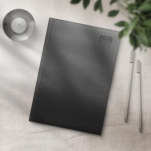 Dagbok Time A5 er en elegant dagbok innbundet i sort imitert skinn med årstallet preget på forsiden. En dag per side gir deg god plass til alle dine notater og månedsregisteret gir deg god oversikt over hele måneden. Lesebåndet gjør det enkelt å markere hvor i kalenderen du er. Den inneholder kalendariske opplysninger, telefonguide, månedsoversikt, årsoversikt, månefaser, helligdager og kongelige fødselsdager. - Innbundet dagbok med kalenderåret 2026 - Månedsregister - Følger kalenderåret - Omslag i imitert skinn - Stående dag/side - Timeinndeling 7-21 - Månedsplaner og årsoversikt for inneværende og kommende år - Månefaser, helligdager og kongelige fødselsdager - Hjørneperforering - Lesebånd - Antall side: 352 - Papirvekt: 60g - Format: 143x205mm