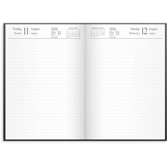 Innbundet kalender i mørk grått imitert skinn. En dag per side gir deg god plass til alle dine notater og månedsregisteret gir deg god oversikt over hele måneden. Lesebåndet gjør det enkelt å markere hvor i kalenderen du er. Den inneholder kalendariske opplysninger, telefonguide, månedsoversikt, årsoversikt, månefaser, helligdager og kongelige fødselsdager. - Innbundet dagbok med kalenderåret 2026 - Månedsregister - Følger kalenderåret - Omslag i imitert skinn - Stående dag/side - Timeinndeling 7-21 - Månedsplaner og årsoversikt for inneværende og kommende år - Månefaser, helligdager og kongelige fødselsdager - Hjørneperforering - Lesebånd - Antall side: 384 - Papirvekt: 80g - Format: 145x205mm - Farge: Mørkegrå