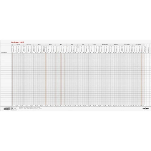 Ferieplanen gir deg fin oversikt over ferie- og fridager. Enkel og oversiktlig i bruk. Kalenderen er miljømerket FSC®, som betyr at hele produktet er produsert med papir og annet trevirke fra et ansvarlig og bærekraftig skogsbruk. - Følger kalenderåret - 27 linjer for medarbeidere - Stående år/oppslag - 1 side - 150g papir - Format: 627x297mm