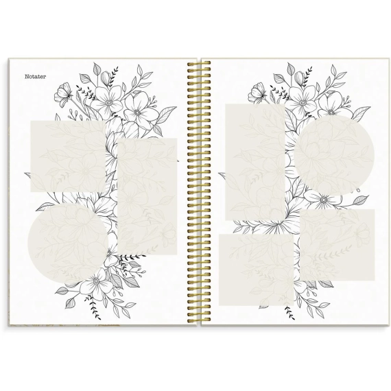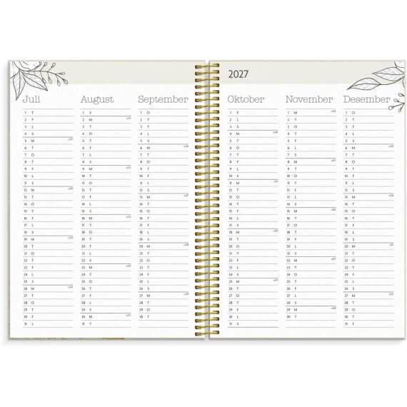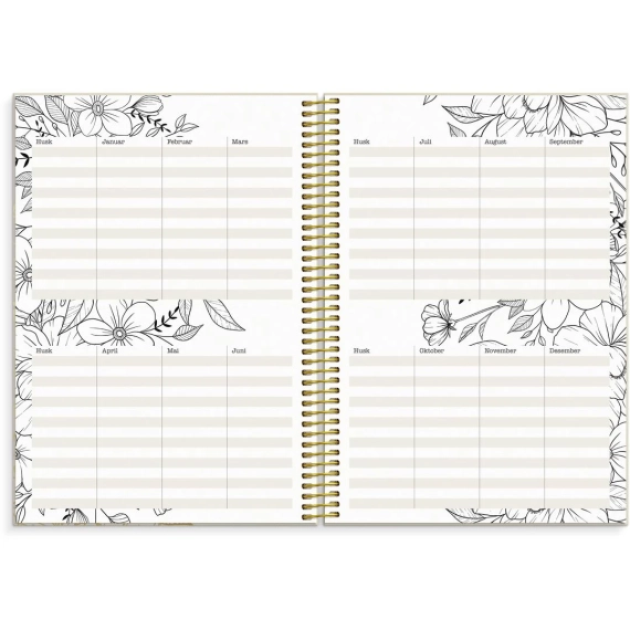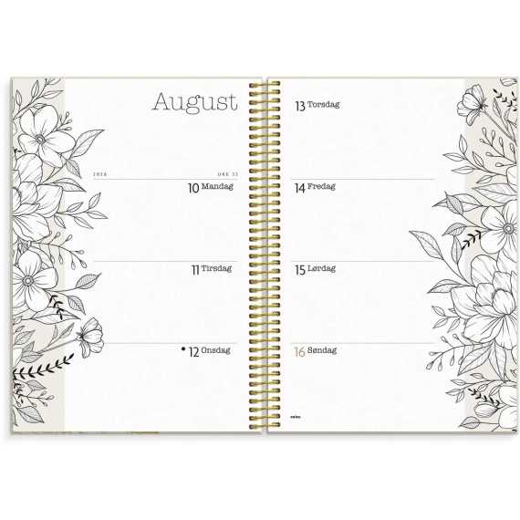 Smakfull og romantisk innmat med håndtegnede illustrasjoner. Brukeren kan velge å beholde den dempede fargeskalaen eller fargelegge selv. Årsoversikt med notatfelt, årsplanlegging og ukentlig oppslag med romantiske blomsterillustrasjoner. Månedlig oppslag med plass til planlegging og notater. Ekstra sider med huskelister og notatsider. Kalenderen er miljømerket FSC®, som betyr at hele produktet er produsert med papir og annet trevirke fra et ansvarlig og bærekraftig skogsbruk. Den har gullfarget spiral og gullfarget preget årstall. Den inneholder månedsoversikt og årsoversikt. - Følger kalenderåret - Omslag i trykket kartong med struktur - Spiralisert - Strikk - Flyttbar sidemarkør/linjal - Notatsider - Sjekklister - Papirlomme bak - Liggende uke/oppslag - Antall sider: 160 - Papirvekt: 120g - Format: 148x210mm