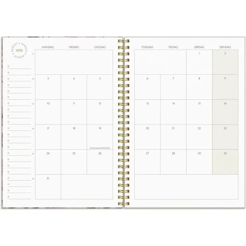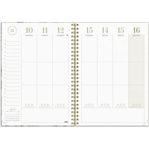 En personlig kalender som fokuserer på velvære og balanse, med ulike verktøy som er innebygd i ukeplanleggingen. Lag din egen unike kalender ved hjelp av klistremerkearket og sett fokus på det som får deg til å føle deg bra. Ved å planlegge livet ditt kan du skape rom i hverdagen som du kan bruke på avslapning og velvære. Bruk sjekklister og notatdelen til å reflektere over det som er viktig for deg. Kalenderen har en flyttbar markør slik at man har kontroll på hvor i boken man er. Kalenderen er miljømerket FSC®, som betyr at hele produktet er produsert med papir og annet trevirke fra et ansvarlig og bærekraftig skogsbruk. Den har gullfarget spiral og gullfarget preget årstall. Den inneholder månedsoversikt og årsoversikt. - Følger kalenderåret - Omslag i trykket kartong med struktur - Spiralisert - Strikk - Flyttbar sidemarkør/linjal - Notatark med dotter og linjer - Sjekklister og Måltracker - Papirlomme bak - Klistremerkeark - Stående uke/oppslag - Hjørneperforering - Antall sider: 160 - Papirvekt: 90g - Format: 148x210mm