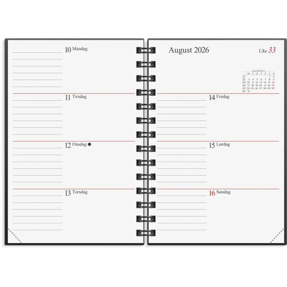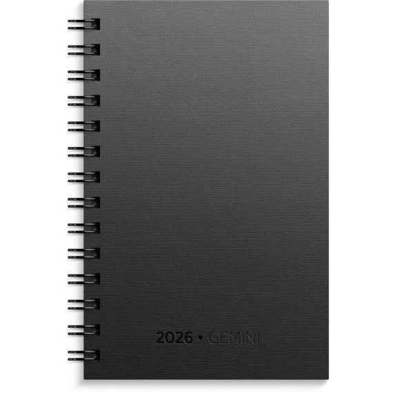 En populær lommekalender i spiralisert kartongomslag. Kalenderen er en del av en større serie med Gemini kalendere. Felles for Gemini er at selv om den er liten nok til å få plass i lommen oppleves den som romslig med god plass til å notere inni. Kalenderen viser hele uken over to sider (ukeoppslag). Den inneholder kalendariske opplysninger, telefonguide, månedsoversikt, årsoversikt, månefaser, helligdager og kongelige fødselsdager. Kalenderen er miljømerket FSC®, som betyr at produktet er produsert med papir og annet trevirke fra et ansvarlig og bærekraftig skogsbruk. - Følger kalenderåret - Får plass både i lommen og i vesken - Omslag i kartong - Spiralisert - Liggende uke/oppslag - Månedsplaner og årsoversikt for inneværende og kommende år - Månefaser, helligdager og kongelige fødselsdager - Linjerte notatsider - Hjørneperforering - 136 sider - 70g papir - Format: 82x123mm