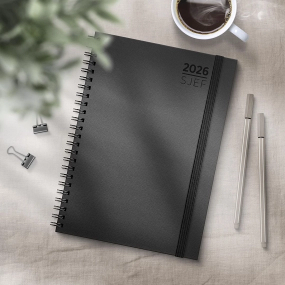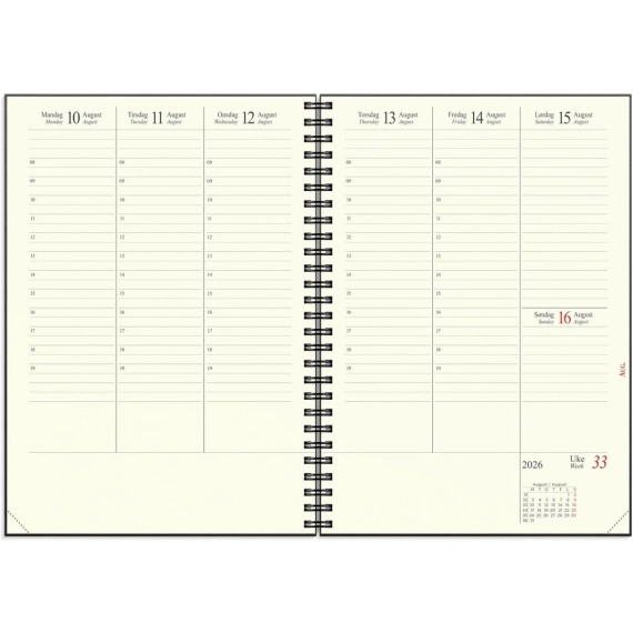 Planlegg med presisjon og eleganse med spiraliserte GRIEG Sjefskalender A5. Kalenderen kombinerer funksjon og finesse med eksklusivt kremfarget papir, utstanset månedsregister og omslag i mykt kartong. Den praktiske A5-størrelsen gir deg oversikt uten å ta for mye plass, perfekt både på kontorpulten og i vesken. Med både norsk og engelsk kalendarium. Inneholder også kalendariske opplysninger, telefonguide, månedsoversikt, årsoversikt, månefaser, helligdager og kongelige fødselsdager. - Funksjonell spiralisert sjefskalender for året 2026 - Følger kalenderåret - Kartongomslag og kremfarget papir - Stående uke/oppslag. Timeinndeling 8-19 mandag til fredag - Månedsplaner og årsoversikt for inneværende og kommende år - Månefaser, helligdager og kongelige fødselsdager - Hjørneperforering - Antall sider: 136 - Papirvekt: 120g - Format: 151x210mm - Farge: Sort