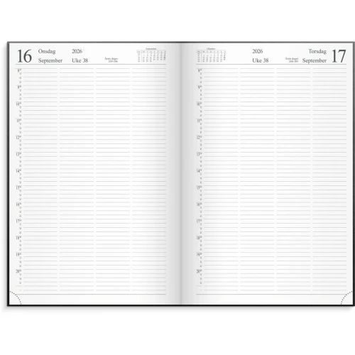 Innbundet dagbok i sort imitert skinn. Hver side er delt inn i fire kolonner og hver linje inndelt i kvarter fra kl. 0800 2100. En dag pr. side mandag fredag, lørdag og søndag på en side. Lesebåndet gjør det enkelt å vite hvor i kalenderen du er. Hjørneperforering. Kalenderen er miljømerket FSC®, som betyr at hele produktet er produsert med papir og annet trevirke fra et ansvarlig og bærekraftig skogsbruk. Den inneholder kalendariske opplysninger, telefonguide, månedsoversikt, årsoversikt, månefaser, helligdager og kongelige fødselsdager. - Følger kalenderåret - Omslag i imitert skinn - Innbundet - Lesebånd - Stående dag/side. Kvarterinndeling 8-20:45 lør/søn. på en side - Telefonguide - Månedsplaner og årsoversikt for inneværende og kommende år - Månefaser, helligdager og kongelige fødselsdager - Hjørneperforering - Antall sider: 336 - Papirvekt: 80g - Format: 195x297mm