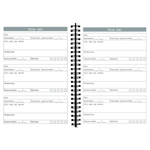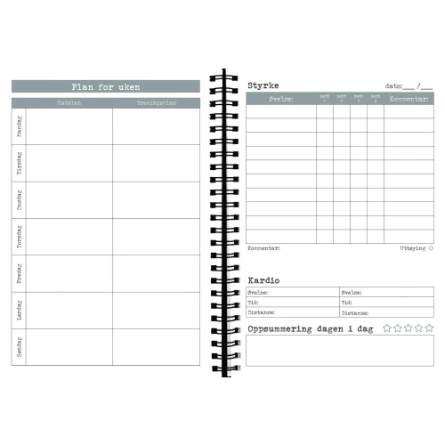 - Spiralisert treningsdagbok med kartongomslag i grått betong-design - Sort preg foran og sort spiral - Treningsdagboken som følger deg i et aktivt halvår(26 uker) - 6 gjentagende sider for egne treningsnotater - Udatert, begynn når det passer deg - Skriv ned dine langsiktige mål og hvordan du skal nå dem - Ukentlig: Sett plan for uken, logg treningen, se utviklingen og oppsummer - 90 g papir - 80 blad(160 sider) - FSC® - Format: A5