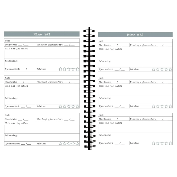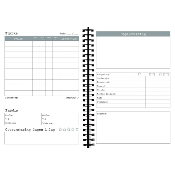 - Spiralisert treningsdagbok med kartongomslag i grått betong-design - Sort preg foran og sort spiral - Treningsdagboken som følger deg i et aktivt halvår(26 uker) - 6 gjentagende sider for egne treningsnotater - Udatert, begynn når det passer deg - Skriv ned dine langsiktige mål og hvordan du skal nå dem - Ukentlig: Sett plan for uken, logg treningen, se utviklingen og oppsummer - 90 g papir - 80 blad(160 sider) - FSC® - Format: A5