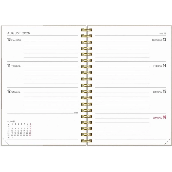 GRIEG Multi A6 2026 gir deg full ukesoversikt i et hendig A6-format, ideell for deg som er mye på farten. Det kompakte designet skjuler en romslig kalender med plass til alt du trenger å notere. Med gullfarget spiral og elegant preget årstall er dette en kalender som kombinerer stil og funksjon. - Spesialisert ukelander for året 2026 - Følger kalenderåret - Kartongomslag med gullpreg - Liggende uke/oppslag - Månedsplaner og årsoversikt for inneværende og kommende år - Månefaser, helligdager og kongelige fødselsdager - Hjørneperforering - Antall sider: 144 - Papirvekt: 90g - Format: 105x148mm - Farge: Beige