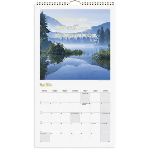 Dream & Do er en lekker veggkalender hvor hver måned er et bilde i seg selv. Planlegg månedens gjøremål, og nyt naturbildene og de tankevekkende sitatene preget i gullfolie. Kalenderen gir deg et godt overblikk og letter planleggingen. Opphengsbøyle gjør det enkelt å henge den på veggen. Kalenderen er miljømerket FSC®, som betyr at hele produktet er produsert med papir og annet trevirke fra et ansvarlig og bærekraftig skogsbruk. - Følger kalenderåret - Nye vakre bilder og sitater hver måned - Opphengsbøyle - Helligdager - Kongelige fødselsdager - Liggende månedsoppslag - 12 sider - 200g papir - Format: 250x450mm
