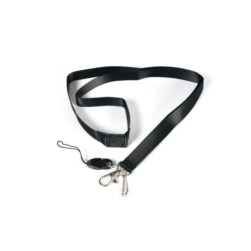 Tekstilkjede i nylon 1,5 x 90cm, Sort. Med beskyttelse mot kvelning, karabinkrok for navnelapper og holder til mobiltelefon.
