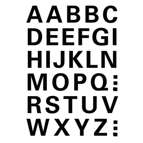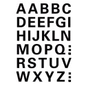 Sorte bokstaver av vannfast PVC-folie. Høyde 15 mm. Liten pakke i format 9x12. Permanent klebende. 1 ark pr. pakke.
