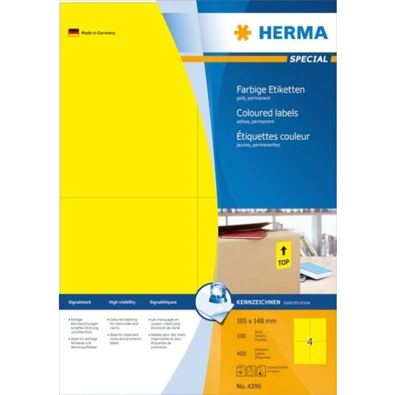 Permanent heftende etiketter for laser og inkjet skrivere samt kopimaskiner. Kan også brukes i fargelaser skrivere og fargekopimaskiner. FSC® Mix Credit sertifisert. Gratis software solutions: www.Herma.com/software. 100 ark per forpakning. 4 per ark. 400 etiketter.