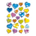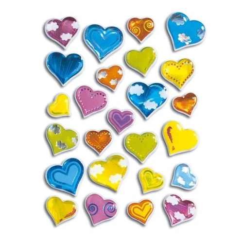 Selvklebende dekorative klistremerker laget av spesielle materialer, med hjertemotiv. For samlere eller for pynt av gaver, brev og andre ting.