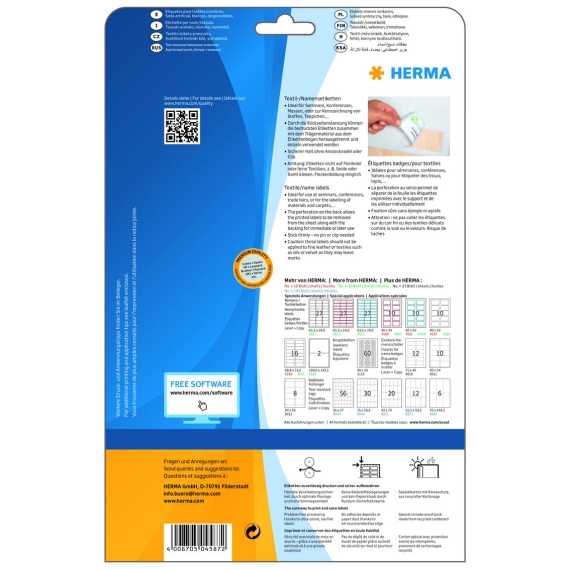 Etiketter av acetatsilke, på A4-ark, selvklebende. Passer perfekt til seminarer, konferanser, messer eller for merking av tøy, matter og madrasser. Praktisk alternativ til plastskilter. Raske å skrive på, og sitter perfekt uten nål. Fleksibelt tekstilmateriale, sikkert klebemiddel, avtagbare. NB: Klistre ikke på fint lær eller fine tekstiler, f.eks silke eller fløyel. For laserskrivere, kopimaskiner, fargelaserskrivere og fargekopimaskiner. Passer ikke for inkjet. Gratis programvareløsninger: www.Herma.com/software.