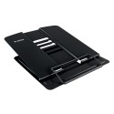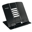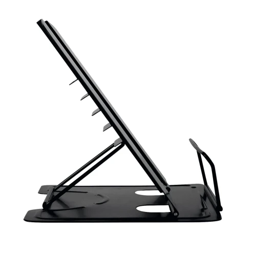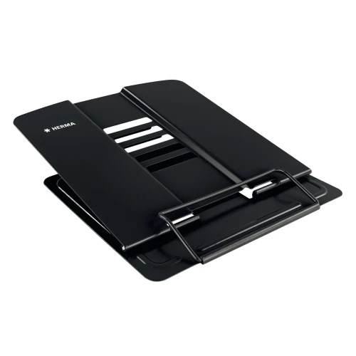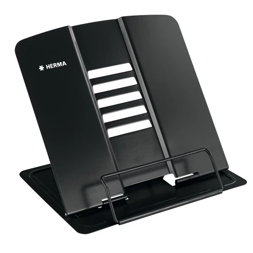 Reading stand, bookend, book and cookbook holder, tablet computer holder: there are many names for HERMA's unique and multifunctional reading rack. The reading rack is black, made of lacquered metal and has a height of 19 cm when opened, a width of 19.8 cm and a depth of 15.7 cm. It is therefore also ideal for heavy books, atlases and computer tablets. Its tilt angle can be adjusted to 5 different positions, making it comfortable for the neck to look at a book or tablet computer whether it's standing on the desk, on campus or in the kitchen. For a firm and optimal stand, it is equipped with slip-resistant knobs on the bottom. If it is not needed or has to be transported, it can be easily folded and stowed away. The multifunctional book stand is also available in the colours blue, white, pink, black and red. Perfect, for example, to give books, tablet computers, magazines, exercise books, music sheets and cookbooks, in different sizes, the perfect stand and hold. Flexible to use in the