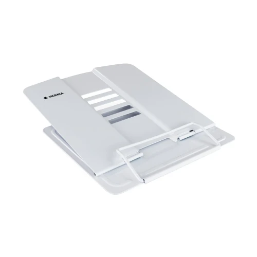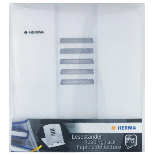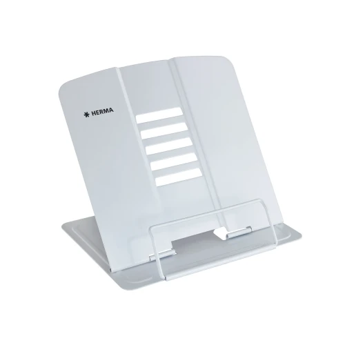 Reading stand, bookend, book and cookbook holder, tablet computer holder: there are many names for HERMA's unique and multifunctional reading rack. The reading rack is white, made of lacquered metal and has a height of 19 cm when opened, a width of 19.8 cm and a depth of 15.7 cm. It is therefore also ideal for heavy books, atlases and computer tablets. Its tilt angle can be adjusted to 5 different positions, making it comfortable for the neck to look at a book or tablet computer whether it's standing on the desk, on campus or in the kitchen. For a firm and optimal stand, it is equipped with slip-resistant knobs on the bottom. If it is not needed or has to be transported, it can be easily folded and stowed away. The multifunctional book stand is also available in the colours blue, white, pink, black and red. Perfect, for example, to give books, tablet computers, magazines, exercise books, music sheets and cookbooks, in different sizes, the perfect stand and hold. Flexible to use in the