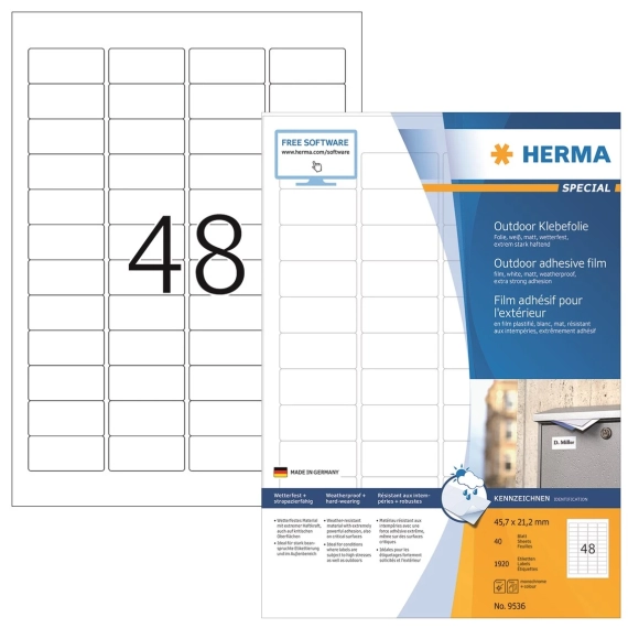 Etikett av hvit selvklebende film som tåler alt fra -40 til +150ºC, vann, olje og skitt, og er dessuten utstyrt med en ekstra sterk klebeevne, også på vanskelige underlag. På A4 ark for utskrift i laser- og fargelaserskrivere eller kopimaskiner. Inneholder: 40 ark med 48 etiket pr. ark.