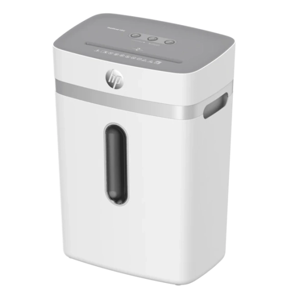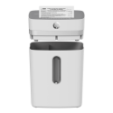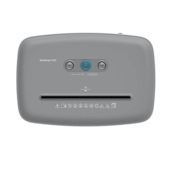 The intuitive operation, the practical start-stop function and the overheating and overload indicator ensure an easy and safe shredding experience. After a six-minute shredding session, the HP OneShred 12CC requires a cool down period before returning to full power. With a weight of 5.9 kg and dimensions of 345 mm x 485 mm (width x height), this handy shredder is easy to transport even without castors.The waste bin has a capacity of 23 litres. To empty, lift the shredder head from the waste bin, empty the box and simply replace the attachment until you hear it click into place. Even without a technical fill level indicator, the viewing window on the waste bin alerts you when it needs empytying.The HP OneShred 12CC comes equipped with awaste bin and user manual, as well as a HP Shredder Oil Sheet for initial cleaning of the shredding head. The cutting unit Cutting capacity: 12 sheets DIN A4 (80 g / m²) Type of cut: Particle cut / Cross cut Particle size: 4 mm