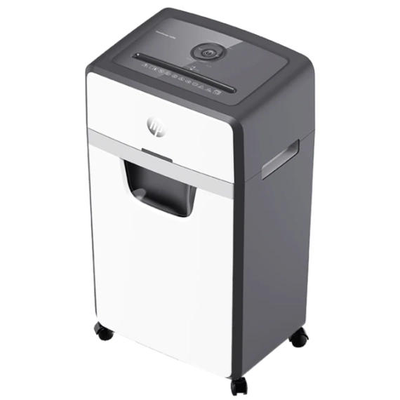 Although the HP OneShred 16MC weighs in at a hefty 18.4kg, its four castors, two of which are lockable, make it easy to place wherever you need it. The generous 30 litre capacity waste bin is removable and comprises an LED display on the front to indicate when has the bin is open or needs to be emptied.Fortunately, paper clips, staples and credit cards are no problem for the reliable HP OneShred 16MC and don't have to be removed prior to shredding entire stacks of documents. After a continuous operation of more than 30 minutes, the paper shredder requires a cool down period before further use. Of course, the paper shredder has an automatic return function in the event of a paper jam as well as an overheating and overload indicator.Normally, the HP OneShred 16MC works relatively quietly with an operating noise of under 65 decibels. To ensure that this is also the case in the long-term the cutting unit should be cleaned regularly. To assist one HP Shredder Oil Sheet is included wi