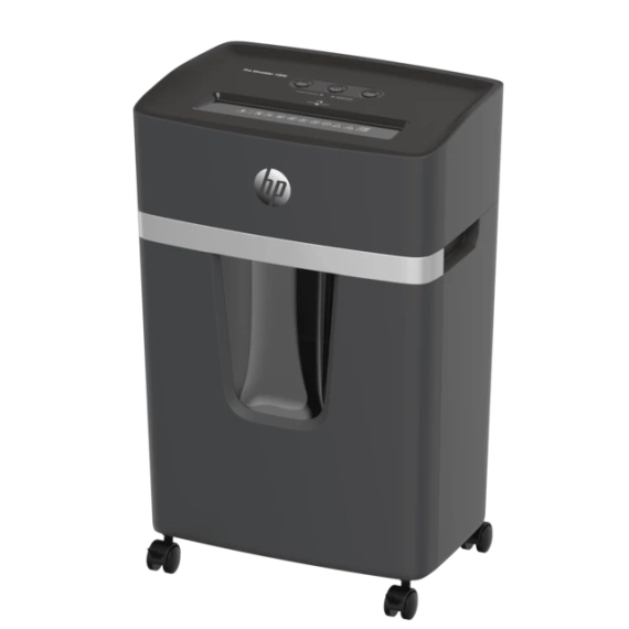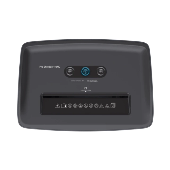The professional HP Pro Shredder 10MC is designed for 20 sheets. The shredder can be used for up to 20 minutes and then needs a cool down period.The pull-out collection container for the shredded material has a capacity of 20 litres, the filling level can be readily checked through the large viewing window.In addition to the auto-reverse function, the HP Pro Shredder 10MC has an automatic start-stop function that ensures that the device stops as soon as no more material is fed in. Shredding credit cards, paper clips or staples is no trouble at all for the modern office shredder and there is no need for tedious removal. If you have fed more than 10 sheets at a time, the reliable shredder stops the process and feeds the paper back to avoid a paper jam.For optimal cutting results, the cutting unit should be cleaned and maintained regularly. This reduces the operating noise and extends the runtime. The HP Pro Shredder 10MC comes ready supplied with one HP Shredder Oil Sheetfor this
