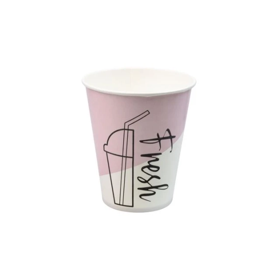 Drikkebegere produsert av kartong, ypperlig til bruk med alle typer kalde drikker. Velegnet for kaféer, uteservering og take away til milkshake, slush, smoothie, brus og annen kald drikke. Pappbegeret har et belegg av plantebasert materiale, ingen bruk av fossile ressurser. Kan benyttes med lokk diameter 90mm, selges separat. - Drikkebeger for kald drikke - Materiale: Papp med belegg av plantebasert PE - Bruksvolum: 30cl - Volum til kanten: 38cl - Øvre diameter: 90mm - Assorterte farger i forpakningen - Antall: 75stk