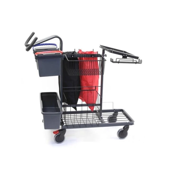 Denne vognen har god plass til materialer. Med et justerbart håndtak, doble vaskeposer og moppebokser med lokk.