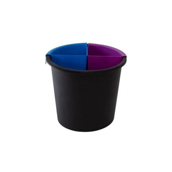 Rund avfallsbeholder på 14L i sort Det er en markert overflate tilpasset klistremerker. - Leveres med 2 stk 1,2 L innsatser. - 1 stk blå - 1 stk lilla.