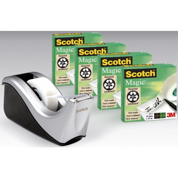 Hver dispenser leveres komplett med 4 ruller med Scotch® Magic™-tape på 19 mm x 33 m. Denne gjennomsiktige tape av høy kvalitet kan også brukes til merking siden den kan skrives på med penn, blyant eller merkepenn. Den usynlige Scotch®-tapen kan brukes til mange forskjellige formål hjemme, på skolen eller på arbeidsplassen.