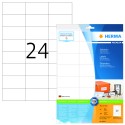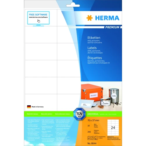 Hvite, permanente heftende etiketter som med ny teknologi også fungerer i skrivere og kopimaskiner med høyastighet utskrift. Like bra i sort/hvitt som i farger. PEFC-sertifisert. Etikettene er helt hvite og gir meget skarpe utskrifter. Gratis software solutions: www.Herma.com/software. 10 ark per forpakning. 21 per ark. 210 etiketter.