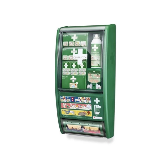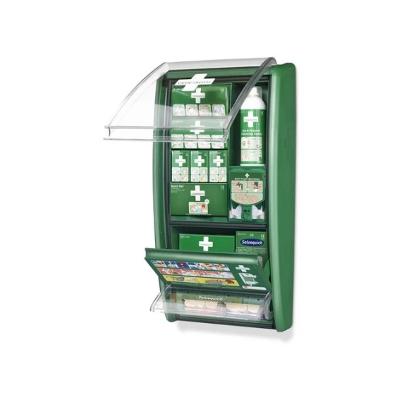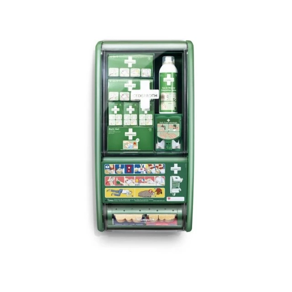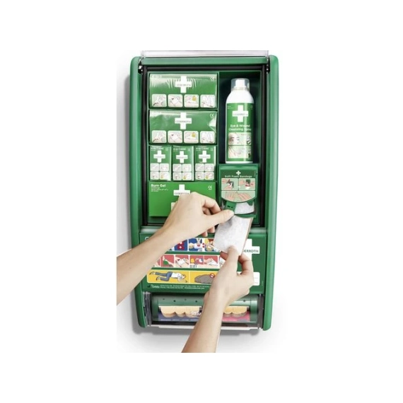 Førstehjelpstasjon med produkter for de fleste typer skader med integrert Soft Foam Dispenser 2 meter. Transparent lokk beskytter mot støv og fukt. Ekstra oppbevaringsrom til eget tilvalg av produkter. - Innhold: 2 stk Cederroth 4-in-1 Blodstopper (REF - 1910/772019), 3 stk Cederroth 4-in-1 mini Blodstopper (REF 1911/905389), 1 (x 2) stk Cederroth Burn Gel Dressing (REF - 901900/110855), 1 Cederroth Eye Wound Cleansing spray 150 ml (REF 726000/110856), 1 Cederroth Soft Foam Bandage Beige 6 cm x 2 m (REF 51011019), 1 Salvequick Plasterautomat inkl. 45 Plastplaster (REF 6036/905384) og 40 Tekstilplaster (REF 6444/785296), 1 (x 20) stk Salvequick Sårvask (REF 323700/776018), 1 Cederroth Beskyttelsespakke (REF 2596/905390), 1 Førstehjelpsinstruksjon, 1 Refillnøkkel, 1 Boremal