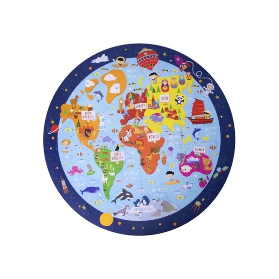 Sirkulært puslespill av verdenskartet. Puslespillet inneholder en plakat som viser den virkelige størrelsen på puslespillet for å lette monteringen. Når puslespillet er satt sammen, vil barna oppdage våre forskjellige kontinenter og hav på planeten vår. Et puslespill som hjelper barn å venne seg til planeten Jorden med et lekemiljø. Puslespill er ideelle spill for barn, for mens de liker å leke, hjelper det dem til å forbedre og utvikle mange ferdigheter: Forbedre konsentrasjonen, observasjonen, hukommelsen og problemløsningen: og de utvikler også romoppfatning, finmotorikk, formgjenkjenning, hånd-øye-koordinasjon og matematiske ferdigheter. I tillegg hjelper puslespill dem til å forbedre selvtilliten og motivasjonen når de er ferdige med spillet. - Inkluderer 48 brikker i ulike størrelser. - Lett å håndtere for barna: tøffe deler, trygge og enkle å håndtere. - 2 mm tykt kort med matt finish og Indiana på baksiden. - En ideell gave til barn! - Anbefalt for barn fra 5 år eller eldre.