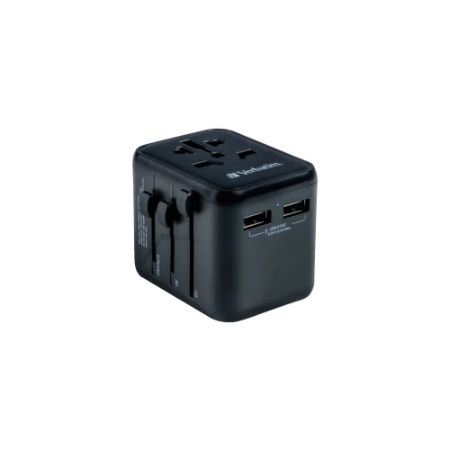 Worldwide Travel AdapterThe Verbatim Universal Travel Adapter can be used in more than 180 countries – take it everywhere with you and never be out of power. This world-to-world multi plug will allow you to connect to any local power supply around the world and recharge your power-hungry devices, like laptops and camera batteries. The two USB-A ports on the bottom can charge all your USB devices including smartphones, Bluetooth speakers, tablets, power banks, and Kindles. Charge three devices simultaneouslyThe compact and powerful Universal Travel Adapter allows simultaneous use of the AC power socket and the dual USB ports. The input voltage of the multi adapter plug is 100-250V, meaning that it can be used worldwide to charge multiple devices. Just push the sliders on the side of the multi plug to reveal the three most common international plugs - EU, UK, and US - and rotate the pins for sockets in Australia or China. Compact and SafeCertified by FCC, UKCA, CE and ROHS, and