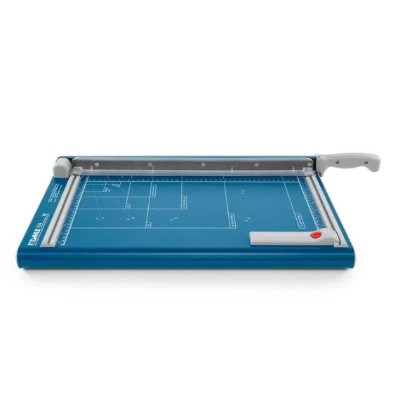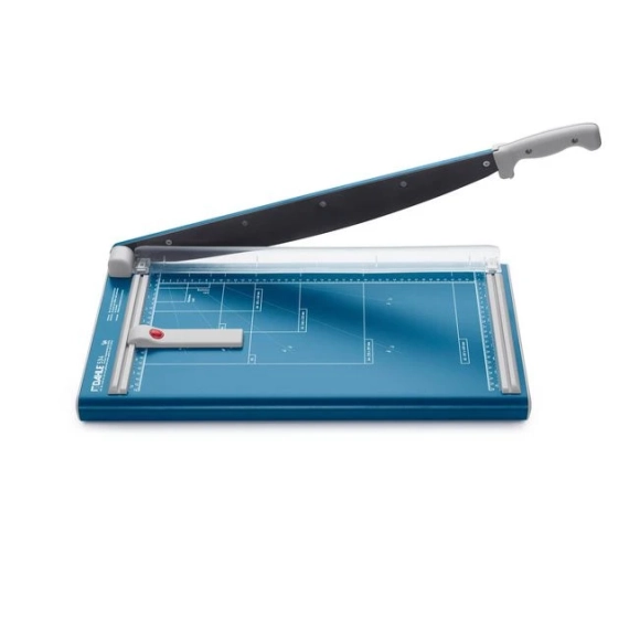 Praktisk giljotin for kuttepresisjon. Kompakt giljotin på inngangsnivå for hobbybruk. Over- og underkniv i stål av høy kvalitet. Skjæremaskin med to målestokker med mm-skala for nøyaktig 90° kutt. Justerbar tilbakestopper for raskt å finne det riktige formatet. - Over- og underkniv i Solingen stål - Ergonomisk formet håndtak. - Integrert fingerbeskyttelse. - Skjærelengde: 460 mm - Skjærekapasitet: 15 mm - Bordflate: 569 x 285 mm - Vekt: 5,8 kg