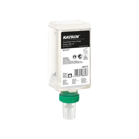 Effektiv og mild skumsåpe med en mild duft av bjørk. Luft- og bakterietett flaske med engangsventil. Meget skånsom mot hendene, og gir en behagelig skumfølelse. - System: Berøringsfri såpedispenser KATRIN 0,5L - Volum: 0,5L - Gir opptil 625 doseringer - Lukt: bjørk - pH-verdi: 4,5 - Miljøsertifisering: Svanen og EU Blomsten - Dermatologisk testet