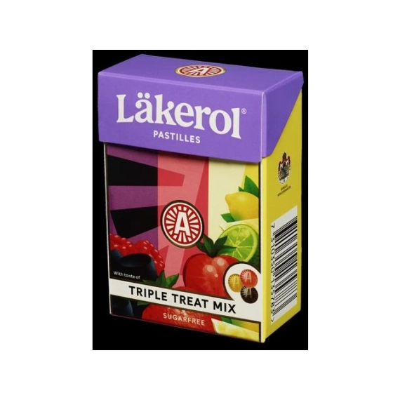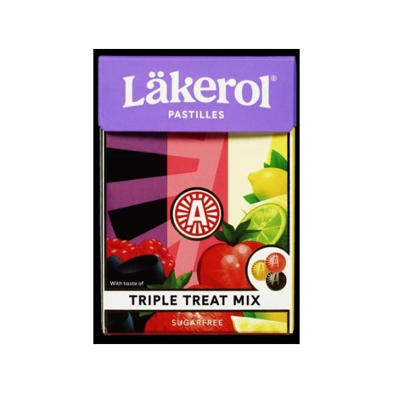 Läkerol Triple Treat er en blanding av pastiller i tre ulike friske og fruktige smaker. Lemon, Strawberry Lime og Raspberry Licorice gir deg den perfekte blandingen av søtt, syrlig och salt. Den klassiske Läkerol-pastillen, i mer moderne smaker, sukkerfri og vegansk. Läkerol Triple Treat Mix eksploderer virkelig både i smak og farge med sin unike blanding av tre ulike Läkerol-smaker, pakket i en stor, fargerik eske - sitron, jordbær og lime, bringebær og lakris. Läkerolpastillene ble lansert første gang i 1909, og er tilgjengelige i over 70 land over hele verden. I Norge spises det mer enn 55 Läkerol pastiller hvert eneste sekund. - Triple Treat Mix med 3 forskjellige smaker i en og samme eske - Nettovekt: 75 gram - Allergener: Ingen - Veganske - Sukkerfrie
