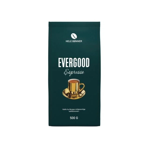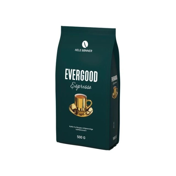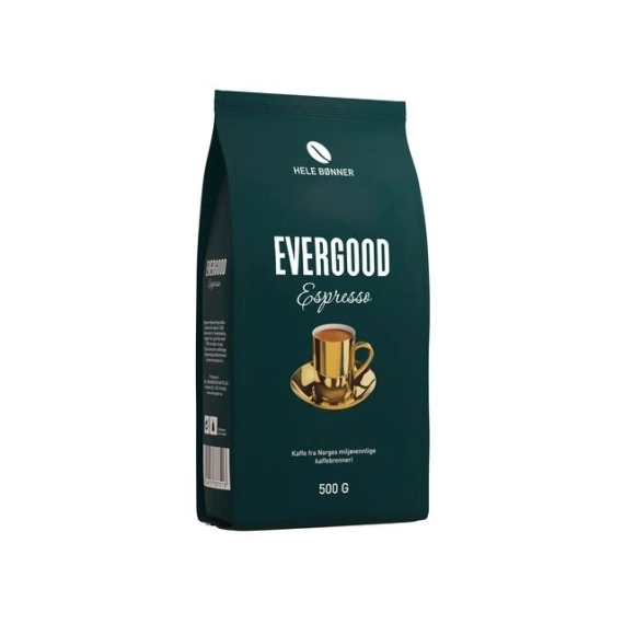 EVERGOOD Espresso er en nøye utvalgt espressoblanding bestående av 100 % høytvoksende Arabica-bønner. En velbalansert og kraftig espresso med fin sødme, fyldig munnfølelse og fine toner av mørk sjokolade, samt en elegant ettersmak med hint av nøtter og bringebær. I frodige fjellområder høyt over havet, finnes det unike klimaet som modner kaffeplantens bønner langsomt. Slik får den fyldige, aromatiske smaksrikdommen som kjennetegner EVERGOOD Kaffe tid til å utvikle seg. Evergood Espresso passer like godt med melk som en ren espresso. - Velbalansert espresso, nytes som den er, eller i ulike kaffedrikker - Bønnetype: Arabica - Kverningsgrad: Hele bønner