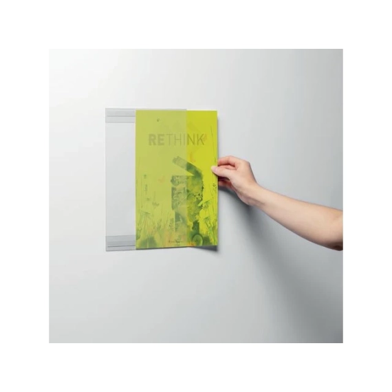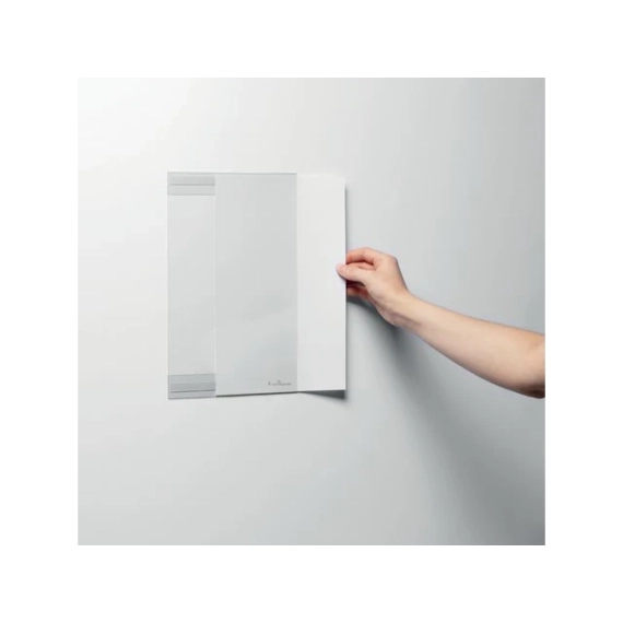 Selvklebende A4-ramme for permanent visning av dokumenter på glatte og ujævne overflater - laget av 80 % resirkulert plast. DURABLE A4 selvklebende ramme er en ideell løsning for enkel og permanent visning av dokumenter på både glatte og ujevne overflater. Med to selvklebende strimler på baksiden festes rammen sikkert, og dokumenter byttes ut ved å skyve dem inn fra siden. Laget av 80 % resirkulert PET-plast, kan de selvklebende strimlene fjernes uten å etterlate rester, noe som gjør det enkelt å resirkulere materialene. Perfekt for bruk innendørs på kontorer, fabrikker eller andre områder som krever tydelig visning. - Permanent selvklebende festing - Egnet for glatte og ujevne overflater - Enkel utskifting av dokumenter fra siden - Laget av 80 % resirkulert PET-plast - Varmeresistent opptil 70°C - Format: A4
