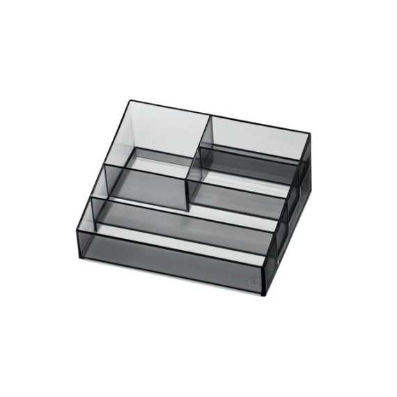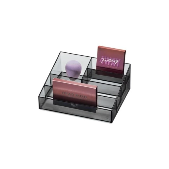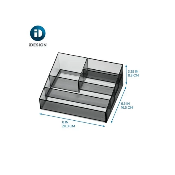 5-roms oppbevaring av makeup- og neglelakk, fra Sarah Tanno Collection av iDesign. Organiser og få orden på alle favoritt neglelakkene og manikyr tilbehøret hjemme. Designet for å være like stilfull som funksjonell. Oppbevaringsbeholderen kan stables og settes på og med andre oppbevarings produkter fra kolleksjonen til Sarah Tanno. Sarah Tanno 5-roms oppbevaring passer for eksempel perfekt på toppen av '3 Drawer Cosmetic Organizer - Tall' fra samme kolleksjon. Sett i sammen og tilpass layoutet slik at det passer ditt unike behov. Fire lagdelte rom for organisering og oppbevaring av neglelakk og sminke, imens den større delen er perfekt for produkter som blandt annet, neglelakk- og sminkefjerner. Kan også bruker til oppbevaring av  sminkepaletter, kosmetikk, hår tilbehør og mer. - Består av slitesterk, BPA-fri plast. - Mål: 20,3 x 16,5 x 8,3 cm - Sotet finish med sort matt kant.  - Kan stables. - Vaskes kun for hånd. - Totalt fem rom.