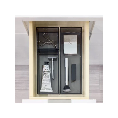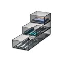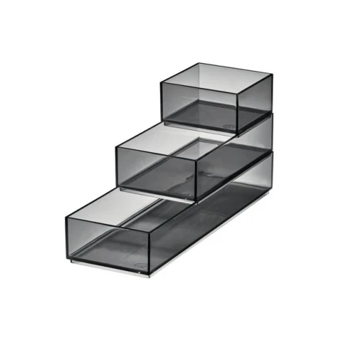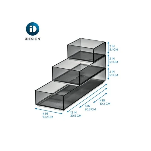 Sett med tre ulike størrelser, designet for å stable og sitte perfekt med hverandre, slik at du kan lagre paletter, pudder, liners, leppestifter og andre produkter raskt og effektivt, praktisk stablet oppå hverandre. Den åpne toppen og de gjennomsiktige sidene gjør det raskt og enkelt å identifisere de produktene du skulle behøve. Hver del av Stack & Slide-boksene kan også brukes alene til oppbevairng i skuff og lignende, eller settes i sammen med andre produkter fra iDesign Signature Series av Sarah Tanno. - Sotet finish med sort matt kant. - Mål: 10,2 cmx (Large: 30,5 / Medium: 20,3 / Small: 10,2)x 5,1 cm