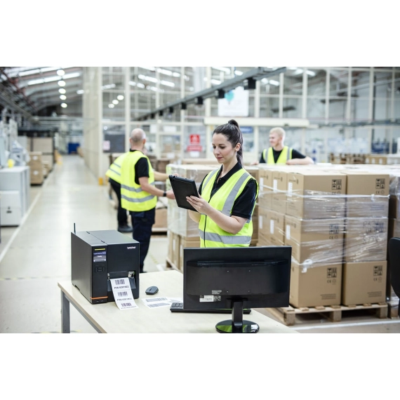 The Brother TJ-4422TN industrial label printer offers performance you can rely on when keeping up with increasing demand. With the inbuilt label rewinder you can easily produce pre-printed label rolls and the intuitive large colour touch display makes it easy to operate. This high-volume thermal transfer label printer has been designed to ensure minimal downtime and maximum productivity through fast print speeds, very large ribbon capacity and in-built durability. With ZPL2 emulation compatibility and multiple connectivity options, the TJ-4422TN has been built with you in mind. • 4-inch thermal transfer/direct thermal printer TT/DT• Print speed 356 mm/sec (14 ips)• Resolution 203 dpi• Print width up to 104 mm• 4,3-inch colour touch display and 6 navigation buttons• Label roll Ø max 203.2 mm (8 inch)• Label roll core Ø min 38.1 max 76.2 mm (1,5-3 inch)• Ribbon roll Ø max 81.3 mm, width 114,3 mm and 600 m long• Rear/botto
