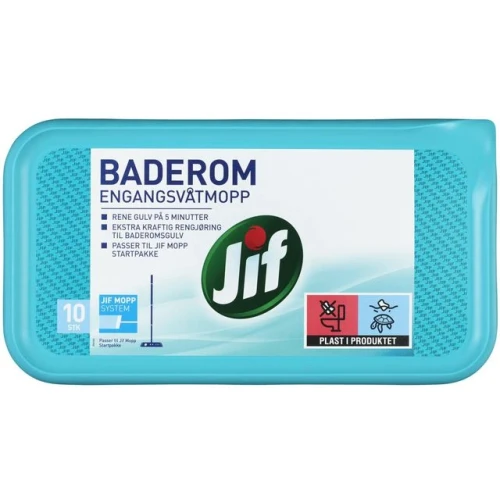 Med Jif Engangsmopp har du løsningen til baderomsgulvet som er klar til bruk – så det er bare å glemme bruke bøtte, vann og såpe. Engangsvåtmoppen vasker enkelt skjoldefritt på fliser, og er spesielt god på baderomsmuss. Passer til Jif Mopp og hjelper deg med å få gulvvasken unna, raskt og effektivt. - Perfekt til bruk på badet og alle flisebeflagte flater - pH-verdi: 10,7 - Pakke med 10 engangsmopper - Fare- og sikkerhetsinformasjon: EUH208, Inneholder 1,2-benzisotiazol-3(2H)-on. Kan gi en allergisk reaksjon.