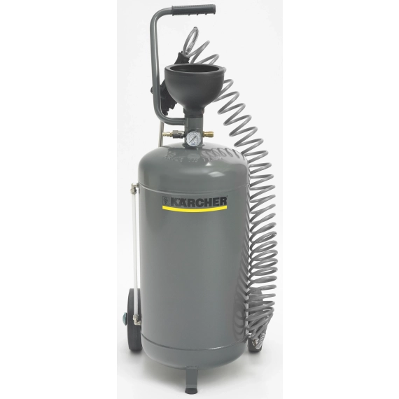 Mobil kjemisprøyte i lakkert stål med to hjul.