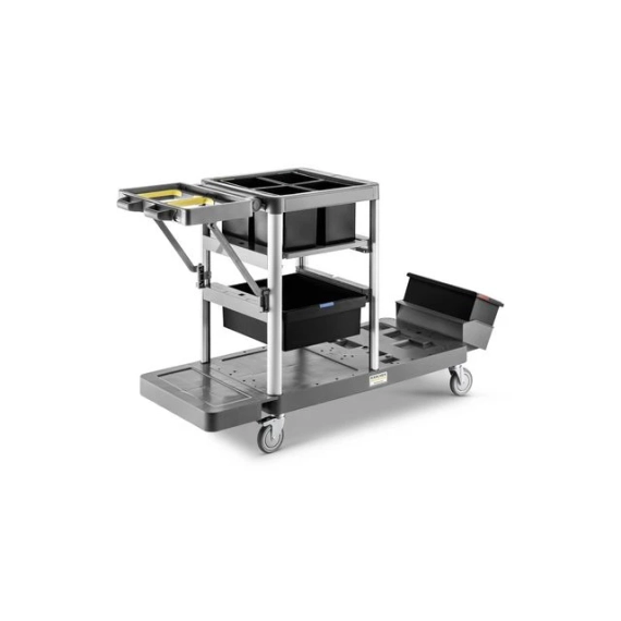 Flexomate Tralle FM Expert 100/M har en åpen design og sjenerøse proporsjoner. Den kan brukes til våt- og tørrrensing enten manuelt ved bruk av forkondisjoneringsmetoden eller mekanisk ved hjelp av passende maskiner. Vognen har nok plass til komfortabelt og enkelt å integrere enten Gulvvaskemaskin BR 30/1 Bp eller Tørrstøvsuger T 9/1 Bp. - Avfallsmodulen kan flyttes opp og ned etter behov og kan romme søppelinnlegg i forskjellige størrelser - Rengjøringsredskaper kan oppbevares trygt i fire praktiske 6-liters bøtter - En 16-liters uttrekkbar skuff som kan plasseres etter behov er egnet for å bære tilleggsutstyr - Med FlexiLink-koblingene som følger med, kan moppsystemer, gripere og nyttige redskaper integreres effektivt.