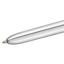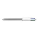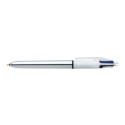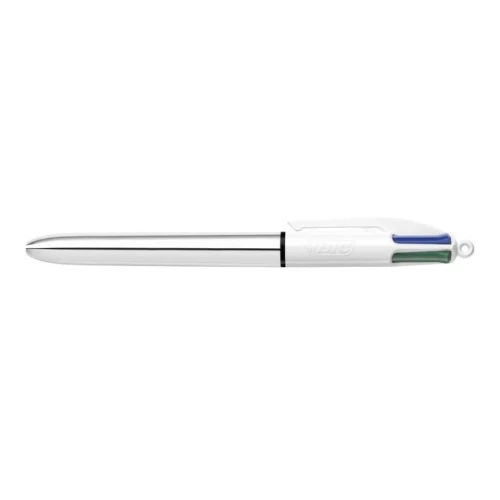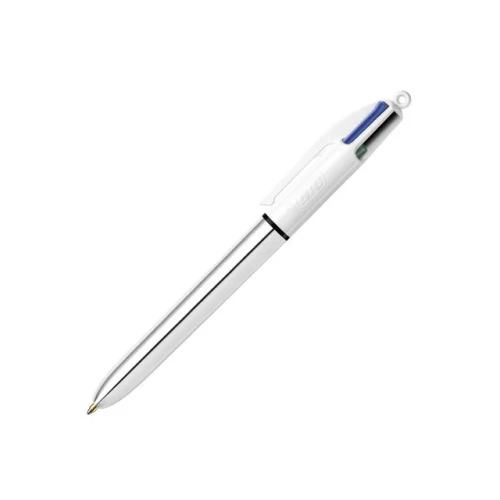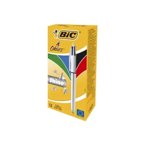 Med fire forskjellige blekkfarger er den inntrekkbare Bic® 4 Colours™ Shine-pennen velegnet for tilpassing av notater og skriving. Denne kulepennen lar deg velge mellom fargene du foretrekker. Pennen er velegnet for oppgaver som krever forskjellige skrivestiler, eller for arbeid som må være spesielt fargerikt. Bic® 4 Colours™-pennen har en middels tykk spiss som kan trekkes inn eller skyves ut etter behov, og pennen passer perfekt til bruk i hjemmet, på skolen eller på jobb. Pennen er designet for daglig bruk i hjemmet, på skolen eller på jobb, og har en bred plastkropp som gir et behagelig grep. En praktisk lommeklips gjør den i tillegg enkel å bære med seg. - Inntrekkbar kulepenn med fire farger - Middels stor spiss på 1 mm - Strekbredde på ca. 0,4 mm - Hurtigtørkende blekk - Bred plastkropp for komfortabelt grep - Helt rund og svært slitesterk kule i wolframkarbid - Kan etterfylles - Praktisk lommeklips - Farge på kropp: Sølvmetallic - Blekkfarger: Sort, blå, rød og grønn